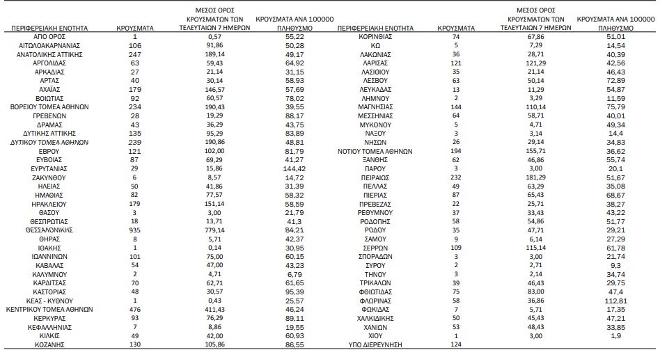 Τα στοιχεία που παρουσιάζονται αφορούν περιστατικά από την επιδημιολογική επιτήρηση της νόσου από το νέο κορωνοϊό (COVID19), με βάση τα δεδομένα που έχουν δηλωθεί στον ΕΟΔΥ και καταγραφεί μέχρι τις 08 Δεκεμβρίου 2021 (ώρα 15:00). Τα νέα εργαστηριακά επιβεβαιωμένα κρούσματα της νόσου που καταγράφηκαν τις τελευταίες 24 ώρες είναι 5.899, εκ των οποίων 7 εντοπίστηκαν κατόπιν ελέγχων στις πύλες εισόδου της χώρας. Ο συνολικός αριθμός των κρουσμάτων ανέρχεται σε 984.301 (ημερήσια μεταβολή +0.6%), εκ των οποίων 50.5% άνδρες. Με βάση τα επιβεβαιωμένα κρούσματα των τελευταίων 7 ημερών, 96 θεωρούνται σχετιζόμενα με ταξίδι από το εξωτερικό και 2.536 είναι σχετιζόμενα με ήδη γνωστό κρούσμα. Οι νέοι θάνατοι ασθενών με COVID-19 είναι 81, ενώ από την έναρξη της επιδημίας έχουν καταγραφεί συνολικά 18.901 θάνατοι. 1 Το 95.4% είχε υποκείμενο νόσημα ή/και ηλικία 70 ετών και άνω. Ο αριθμός των ασθενών που νοσηλεύονται διασωληνωμένοι είναι 709 (59.9% άνδρες). Η διάμεση ηλικία τους είναι 64 έτη. To 79.3% έχει υποκείμενο νόσημα ή/και ηλικία 70 ετών και άνω. Μεταξύ των ασθενών που νοσηλεύονται διασωληνωμένοι, 576 (81.24%) είναι ανεμβολίαστοι ή μερικώς εμβολιασμένοι και 133 (18.76%) είναι πλήρως εμβολιασμένοι. Από την αρχή της πανδημίας έχουν εξέλθει από τις ΜΕΘ 3.579 ασθενείς. Οι εισαγωγές2 νέων ασθενών Covid-19 στα νοσοκομεία της επικράτειας είναι 449 (ημερήσια μεταβολή +10.86%). Ο μέσος όρος εισαγωγών του επταημέρου είναι 427 ασθενείς.Η διάμεση ηλικία των κρουσμάτων είναι 38 έτη (εύρος 0.2 έως 106 έτη), ενώ η διάμεση ηλικία των θανόντων είναι 78 έτη (εύρος 0.2 έως 106 έτη). Κατανομή ανακοινωθέντων εγχώριων κρουσμάτων: Από το σύνολο των 5.899 νέων κρουσμάτων του νέου ιού στη χώρα 12 είναι εισαγόμενα εκ των οποίων 7 εντοπίστηκαν κατόπιν ελέγχων στις πύλες εισόδου της χώρας.