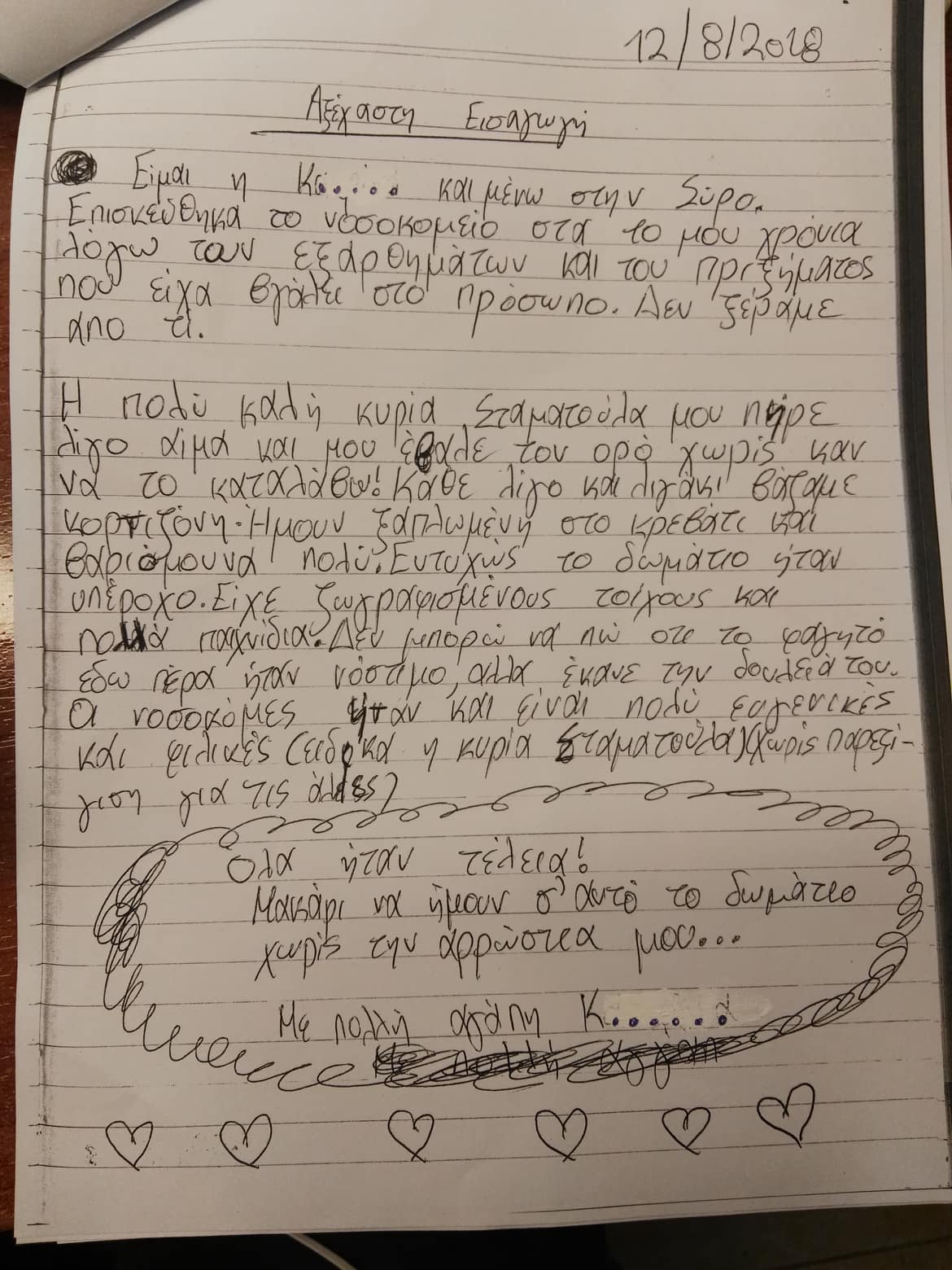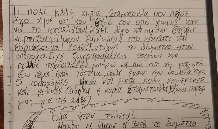 Στην ερώτηση αν το Γενικό Νοσοκομείο Σύρου και η πλευρά της διοίκησης γίνεται αποδέκτης θετικών σχολίων αναφορικά με τη λειτουργία της Παιδιατρικής Κλινικής, η Μαργαρίτα Μπουραντά, παρέπεμψε την εφημερίδα στο βιβλίο ασθενών που γράφουν είτε τα μεγαλύτερα παιδιά για τη νοσηλεία τους, είτε οι ίδιοι οι γονείς των παιδιών που νοσηλεύθηκαν στο νέο Τμήμα.