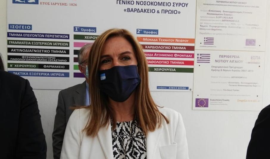 Αναγνωρίζουμε την κόπωση που έχει το προσωπικό και θα εξεύρουμε τρόπους για να το ενισχύσουμε” συμπλήρωσε παρακάτω, επισημαίνοντας κατά την πρώτη δήλωσή της πως, “Θέλω να δώσω θερμά συγχαρητήρια στη Διοίκηση του Νοσοκομείου, η οποία σε συνεργασία αγαστή με τους εργαζόμενους έχει καταφέρει ένα εξαιρετικό αποτέλεσμα. Η Σύρος βρίσκεται αυτή τη στιγμή με πολύ χαμηλό ιικό φορτίο και ελπίζουμε να συνεχίσουμε έτσι”.