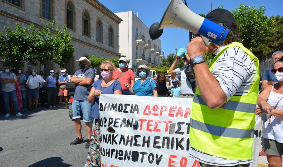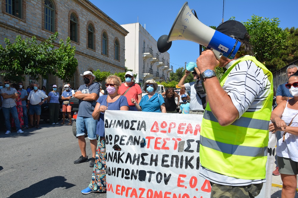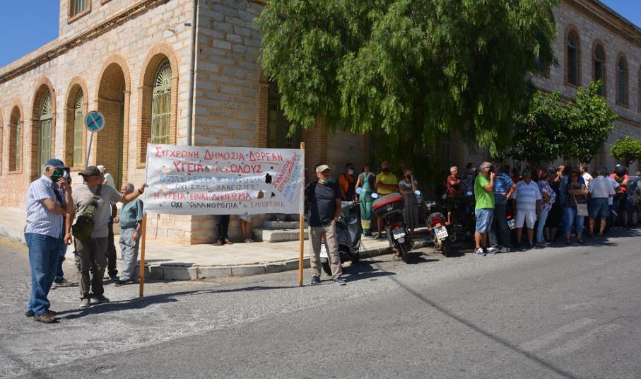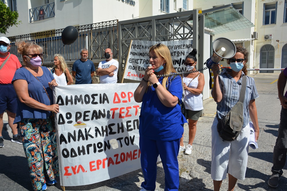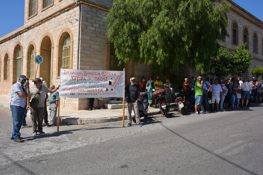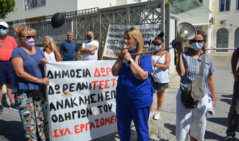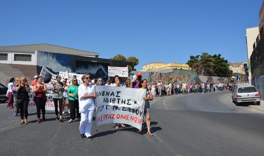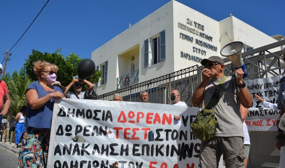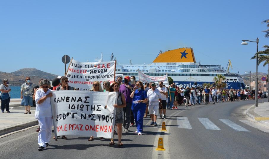 Εργαζόμενοι και κάτοικοι της Σύρου συγκεντρώθηκαν από νωρίς έξω από το νοσοκομείο από όπου λίγο αργότερα ξεκίνησε πορεία διαμαρτυρίας με κατεύθυνση την πλατεία Μιαούλη.
