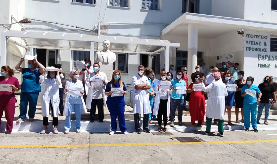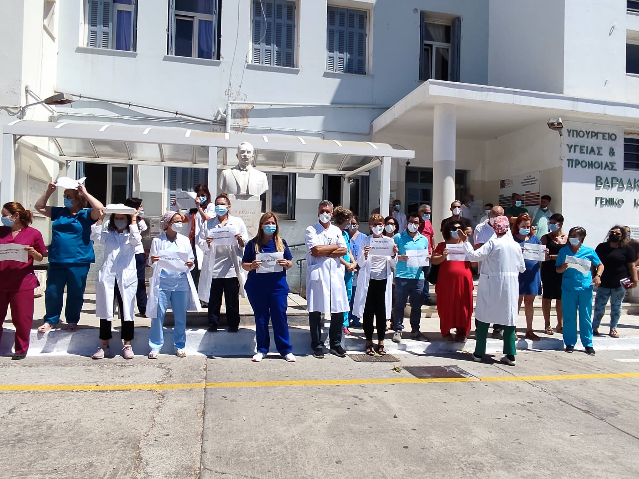 Στον εξωτερικό χώρο είχαν συγκεντρωθεί μέλη του σωματείου εργαζομένων του νοσοκομείου Σύρου και μέλη του ΔΣ της ΕΙΝΟΣ.