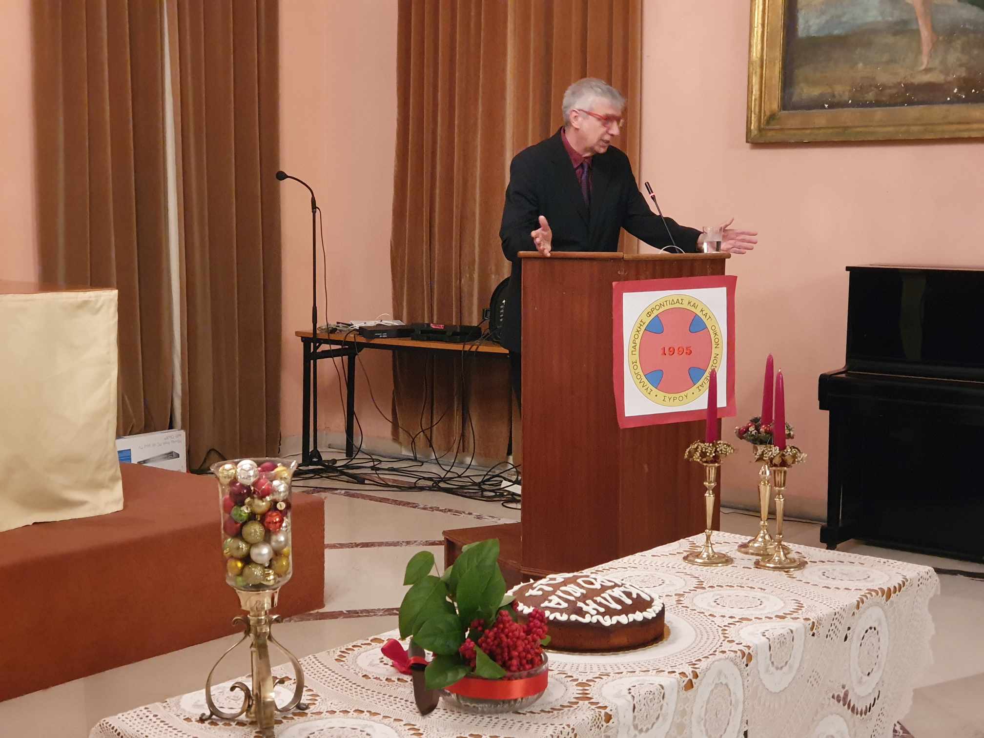 Κατά τη διάρκεια εορταστικής εκδήλωσης, που έλαβε χώρα στην αίθουσα «Ρίτσος» του πνευματικού Κέντρου Ερμούπολης, ο πρόεδρος του Συλλόγου Παροχής Φροντίδας και Κατ’ οίκον Νοσηλείας, παρουσία μελών του Διοικητικού Συμβουλίου, φίλων και μελών, αλλά του αντιδημάρχου Οικονομικών, Δημήτρη Κοσμά, της αντιδημάρχου Πολιτισμού, Θωμαής Μενδρινού και του αντιδημάρχου Διοικητικών Υπηρεσιών, Νίκου Σκευοφύλακα, αναφέρθηκε στα πεπραγμένα από το 2021 έως και το τέλος του 2023.