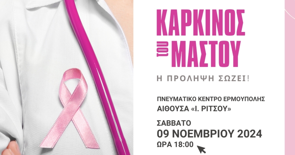 Εκδήλωση για την πρόληψη του καρκίνου του μαστού, θα πραγματοποιήσει το Σάββατο 09 Νοεμβρίου 2024 και ώρα 18:00 στην αίθουσα "Ι. Ρίτσου" στο Πνευματικό Κέντρο Ερμούπολης, ο Ιατρικός Σύλλογος Κυκλάδων.