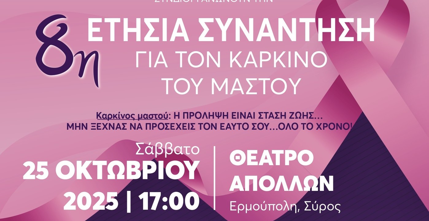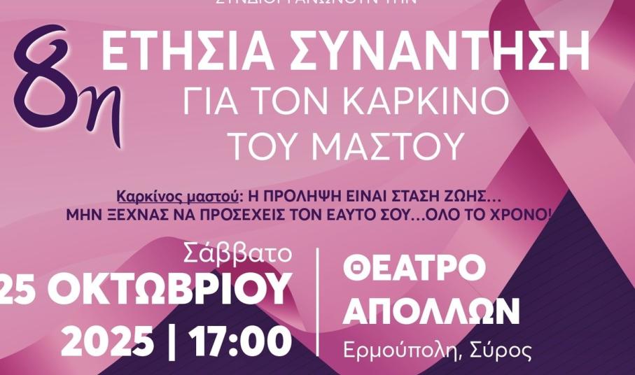Με το σύνθημα “η πρόληψη είναι στάση ζωής... μην ξεχνάς να προσέχεις τον εαυτό σου όλο τον χρόνο”, το ''Κέντρο Ψηφιακής Απεικονιστικής Διάγνωσης'' του Σέργιου Απέργη με τη σύμπραξη για πρώτη φορά του Δήμου Σύρου - Ερμούπολης και πιο συγκεκριμένα του Τμήματος Πολιτισμού, διοργανώνουν την 8η ετήσια συνάντηση για τον καρκίνο του μαστού.