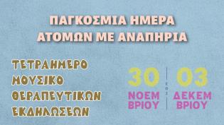 Τετραήμερο μουσικοθεραπευτικών εκδηλώσεων για παιδιά με ειδικές εκπαιδευτικές ανάγκες, για φροντιστές, γονείς, εκπαιδευτικούς, θεραπευτές, και μουσικούς Κυριακή 30 Νοεμβρίου – Τετάρτη 3 Δεκεμβρίου 2025.