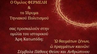 Τη διάλεξη του ιστορικού Άρη Κατωπόδη με τίτλο: “Ω θαυμάτων ξένων, ω πραγμάτων καινών: Σύμβολα Πάθους Θείου και Ανθρώπινου”, παρουσιάζει το Σάββατο 4 ...