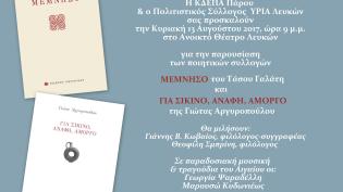 Την Κυριακή 13 Αυγούστου και ώρα 21:00, στο Ανοιχτό Θέατρο Λευκών θα παρουσιαστούν οι ποιητικές συλλογές: «Για Σίκινο, Ανάφη, Αμοργό» της Γιώτας Αργυ...