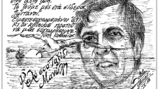 Σκίτσο του Τάκη Χάλαρη με θέμα: "Στη μνήμη του Μανώλη Μάινα"