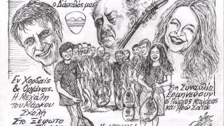 Σκίτσο του Τάκη Χάλαρη με θέμα: "ΕΝ ΧΟΡΔΑΙΣ ΚΑΙ ΟΡΓΑΝΟΙΣ"