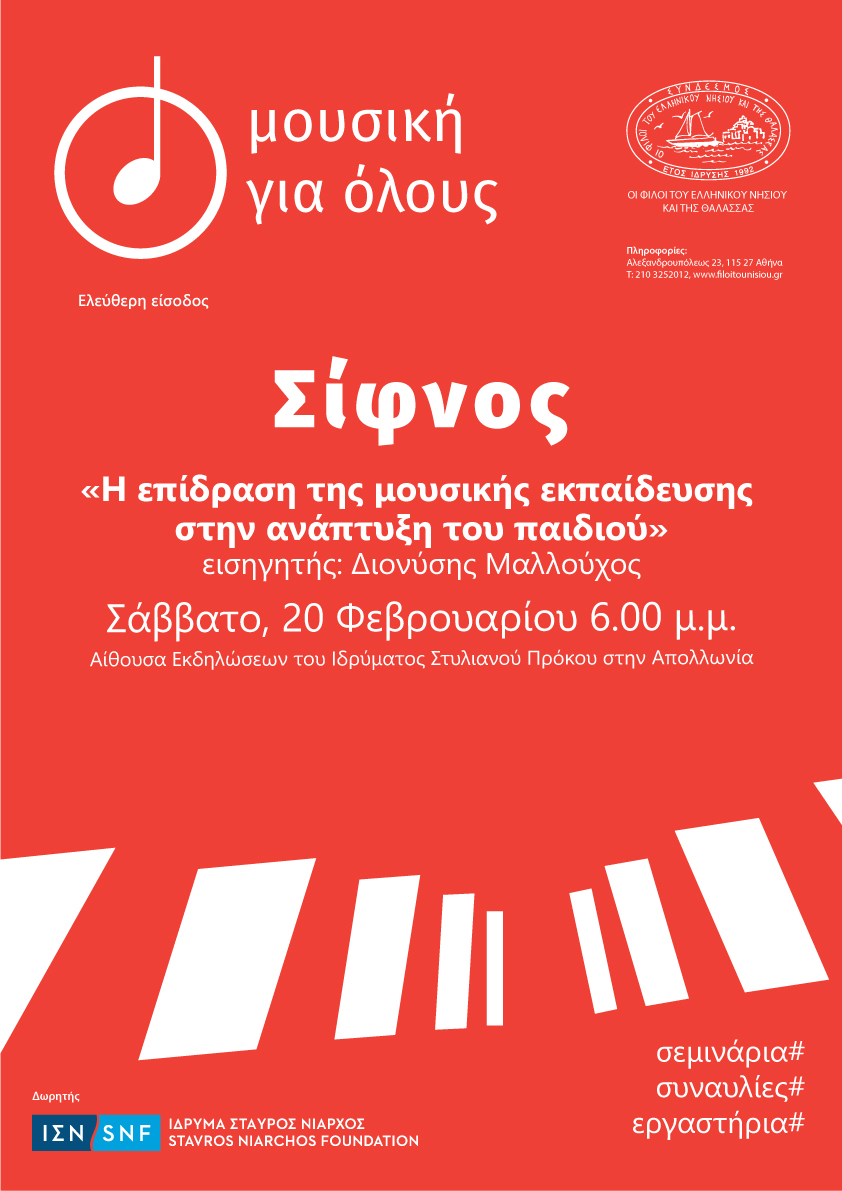 Ο Σύνδεσμος «Οι Φίλοι του Ελληνικού Νησιού και της Θάλασσας» έχει τη χαρά να σας προσκαλέσει στην εισήγηση του μουσικού Διονύση Μαλλούχου, με θέμα «Η επίδραση της μουσικής εκπαίδευσης στην ανάπτυξη του παιδιού» η οποία θα πραγματοποιηθεί στην Αίθουσα Εκδηλώσεων του Ιδρύματος Στυλιανού Πρόκου στην Απολλωνία, το Σάββατο, 20 Φεβρουαρίου 6.00 μ.μ., στο πλαίσιο του επιμορφωτικού προγράμματος «Μουσική για όλους».