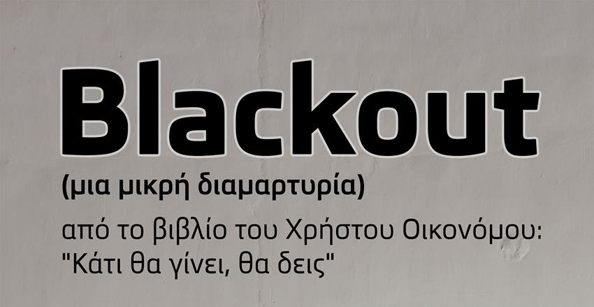 Η παράσταση «Blackout (μια μικρή διαμαρτυρία)» με τον Χρήστο Σαπουντζή σε σκηνοθεσία Ειρήνης Μαργαρίτη ταξιδεύει σε όλη την Ελλάδα και επιστρέφει τις Κυριακές στο Ικαριώτικο Καφενείο «Χαλαρά» στα Εξάρχεια! Στις 7 και 8 Μαρτίου κάνει στάση στη Σύρο (Ερμούπολη) για 2 μοναδικές παραστάσεις.