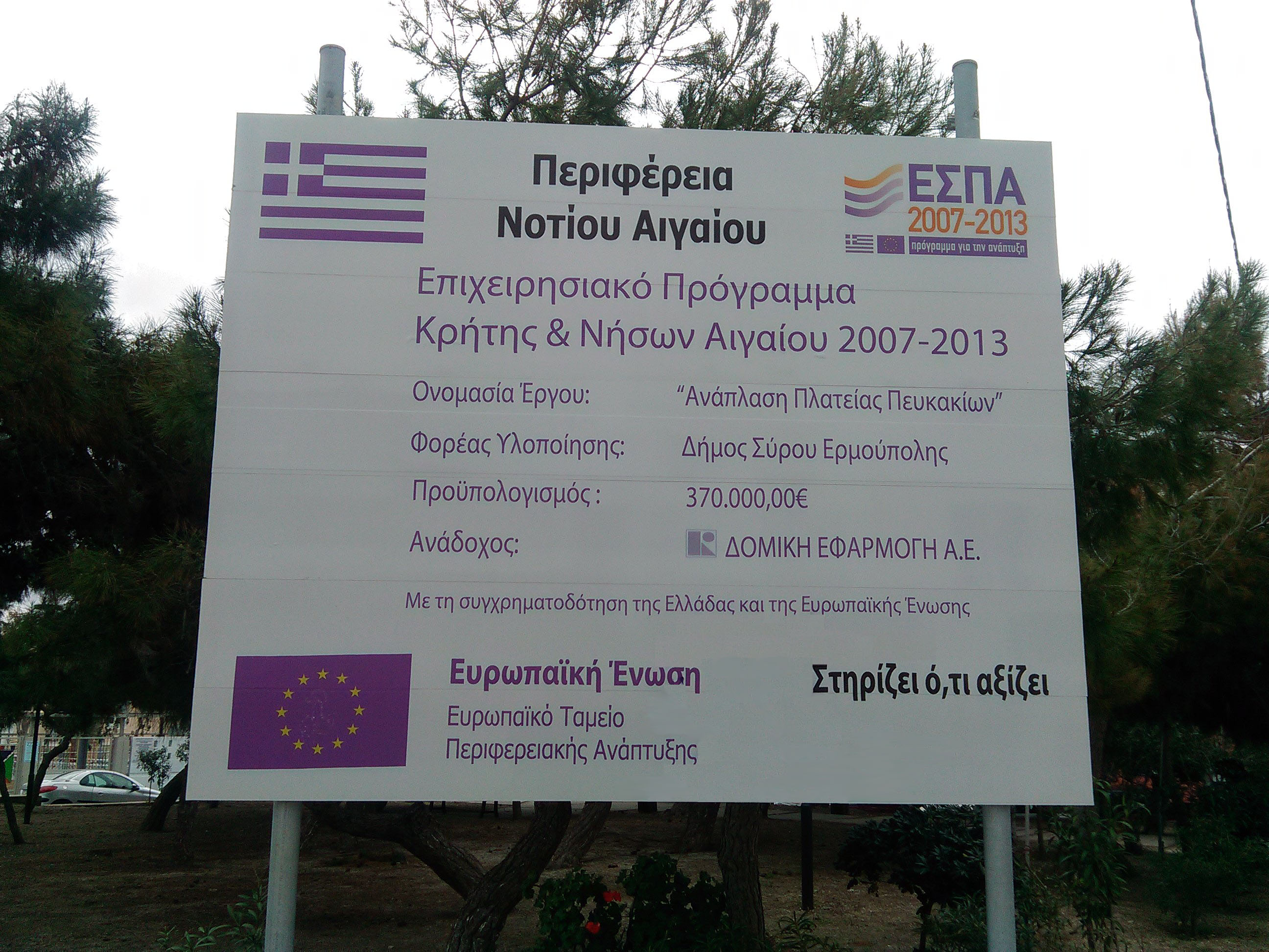 Πρόκειται για υποέργο της Πράξης: "Δράσεις Αναβάθμισης Φυσικού και Δομημένου Περιβάλλοντος Ερμούπολης" με τίτλο: "Ανάπλαση της πλατείας και της διαμόρφωσης της παιδικής χαράς περιοχής Πευκακίων", προϋπολογισμού 361.846,89€.