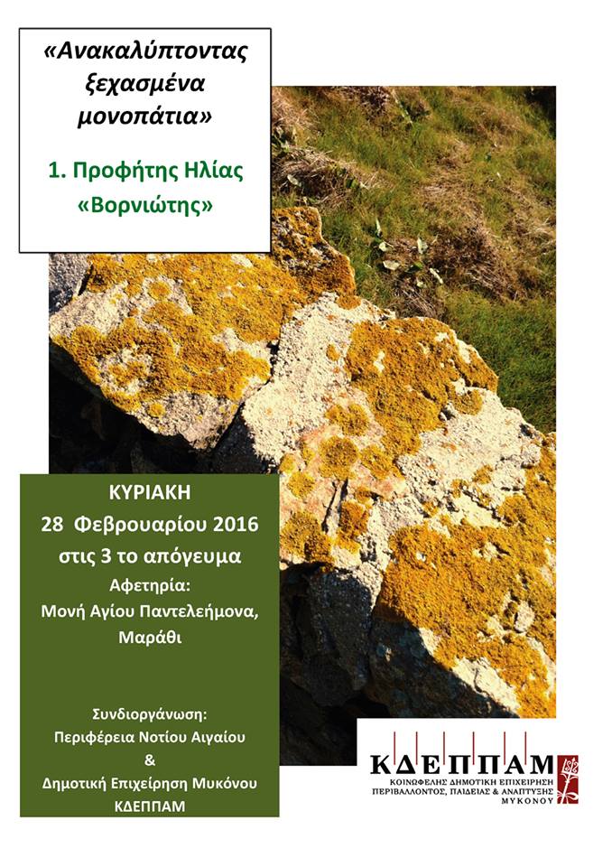 Η Κοινωφελής Δημοτική Επιχείρηση Περιβάλλοντος Παιδείας και Ανάπτυξης Μυκόνου σε συνεργασία με την Περιφέρεια Νοτίου Αιγαίου, ξεκινούν μια πρώτη προσπάθεια προσέγγισης και γνωριμίας με τα μονοπάτια που υπάρχουν στην ύπαιθρο της Μυκόνου.