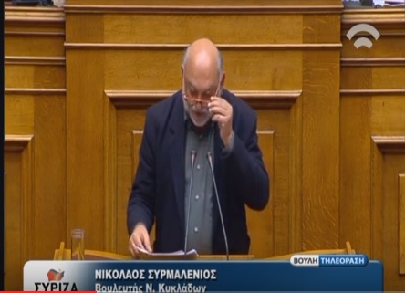 Το σχέδιο νόμου του Υπουργείου Εσωτερικών και Διοικητικής Ανασυγκρότησης για διαφάνεια, αξιοκρατία και αποτελεσματικότητα της Δημόσιας Διοίκησης είναι πραγματικά άλλη μία ριζοσπαστική τομή για την Κυβέρνηση ΣΥΡΙΖΑ-ΑΝΕΛ, παρά το ασφυκτικό πλαίσιο στο οποίο βρίσκεται και τις τεράστιες εξωτερικές πιέσεις που συντελούνται αυτή την ώρα, με το προσφυγικό κύμα και με τη δημοσιονομική ασφυξία. Αυτό δήλωσε, μεταξύ άλλων ο βουλευτής Κυκλάδων Νίκος Συρμαλένιος, κατά την ομιλία του στην Ολομέλεια της Βουλής, κατά τη συζήτηση του νομοσχεδίου.