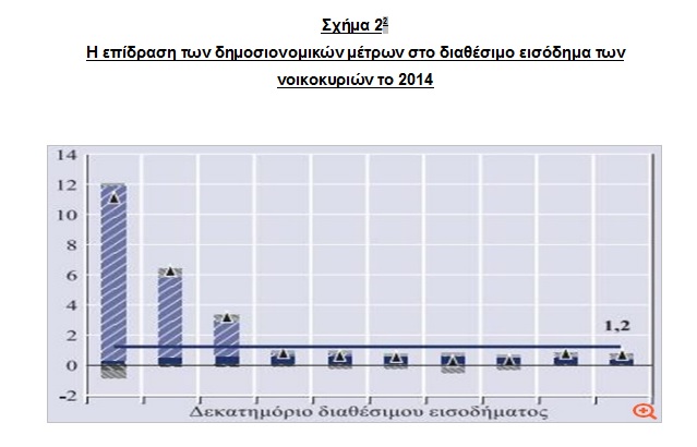 Η μείωση ξεπέρασε το 8% στην κατηγορία του 10% των φτωχότερων πολιτών, ενώ λόγω αυξήσεων εισοδήματος στα μεσαία - μεγάλα κλιμάκια, μεσοσταθμικά το εισόδημα φαίνεται να μειώθηκε μόνο κατά 0,3% (σχήμα 1). Και αυτό μάλιστα, όταν το 2014 είχε καταγραφεί άνοδος κατά 1,2% στο διαθέσιμο εισόδημα (σχήμα 2).