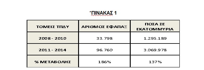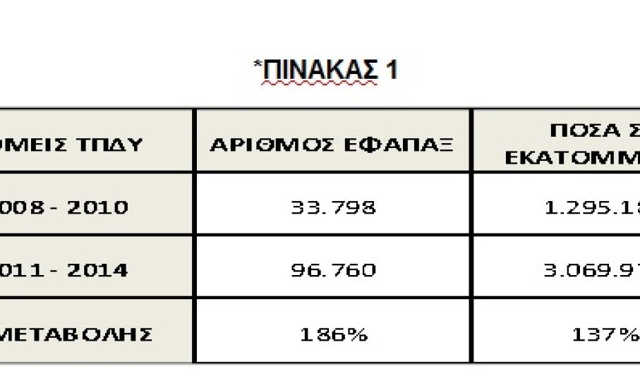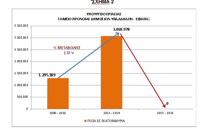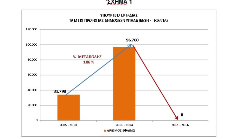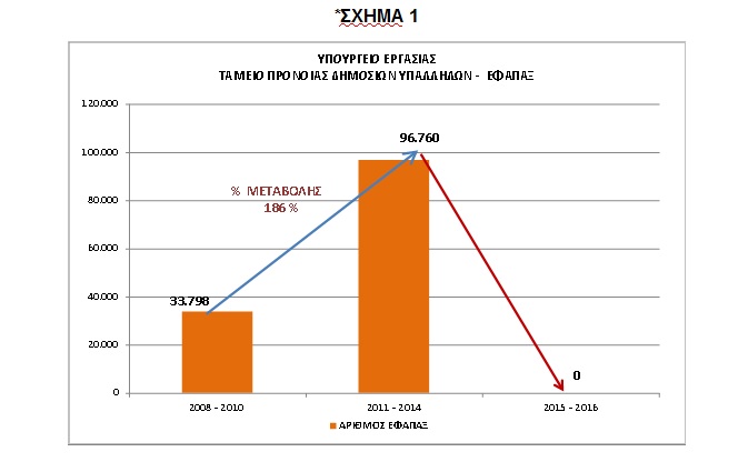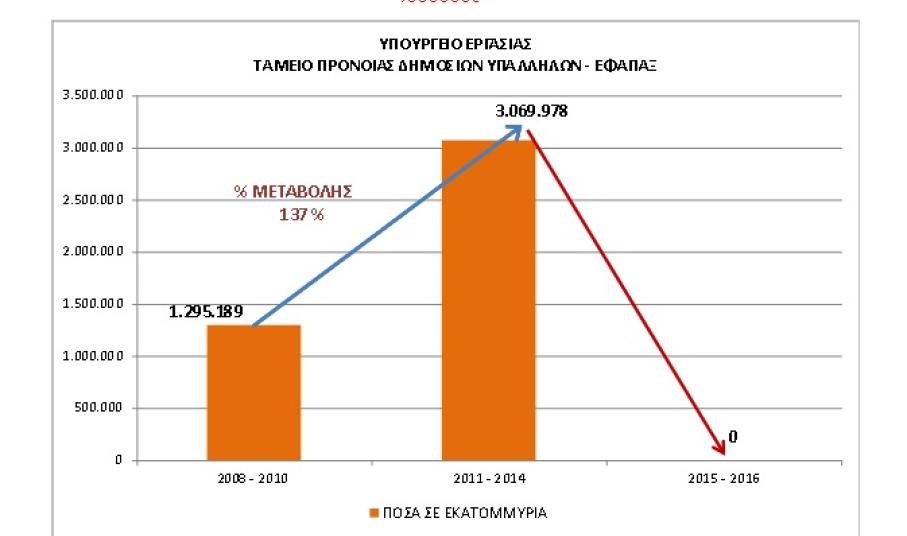 Υπενθυμίζεται, ότι το Υπουργείο Εργασίας επί Ν.Δ., με συστηματικές και οργανωμένες προσπάθειες κατάφερε να μειώσει στο ελάχιστο τις εκκρεμότητες στα ταμεία των εφάπαξ παροχών. Επισημαίνεται, ότι ο αριθμός των χορηγούμενων εφάπαξ στο Ταμείο Πρόνοιας Δημοσίων Υπαλλήλων (Τ.Π.Δ.Υ.) για τα έτη 2011-2014 –παρά το περιοριστικό δημοσιονομικό περιβάλλον- αυξήθηκε έναντι του αριθμού των εφάπαξ για τα έτη 2008-2010 κατά ποσοστό περίπου 186%! Αντίστοιχα, το ποσό των χορηγούμενων εφάπαξ για τα έτη 2011-2014 αυξήθηκε έναντι του ποσού των εφάπαξ για τα έτη 2008-2010 κατά ποσοστό περίπου 137% (*Πίνακας 1), (Σχήμα 1), (Σχήμα 2).