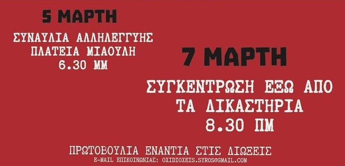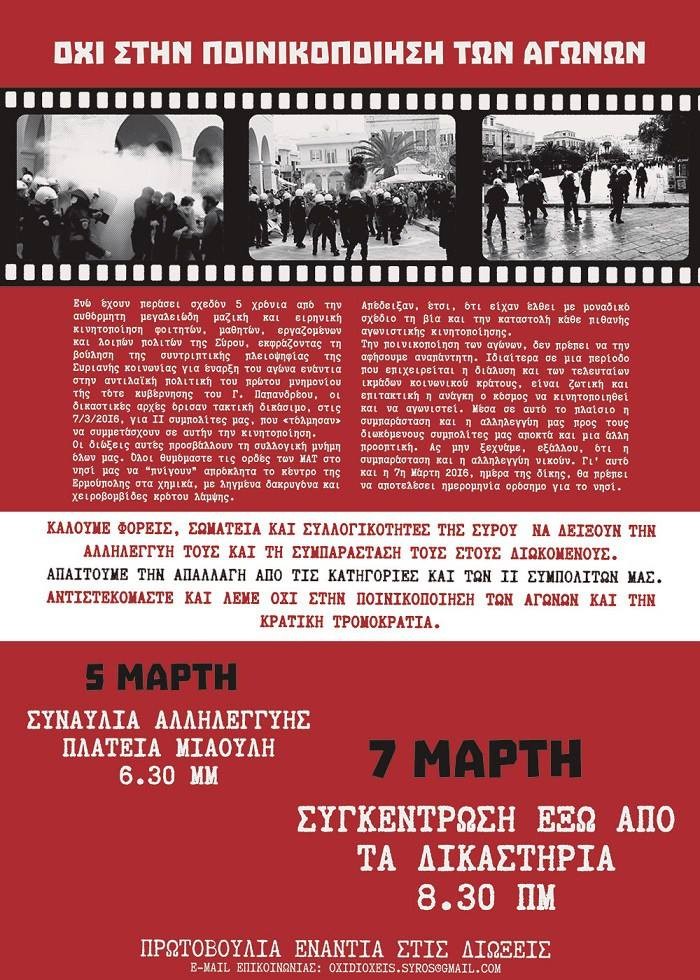 Η εκδίκαση αυτής της υπόθεσης ξεκινάει τις επόμενες ημέρες και θεωρούμε ότι έχει σαφή πολιτική στόχευση. Επιδιώκεται να τρομοκρατηθούν όποιοι αντιστέκονται στις πολιτικές βαρβαρότητας και κοινωνικής λεηλασίας. Θέλουν να επιβάλουν την υποταγή στη νεολαία και τον κόσμα της εργασίας ώστε να υλοποιήσουν τα προαπαιτούμενα του νέου μνημονίου. Είναι γνωστή μέθοδος στις δυνάμεις του κεφαλαίου να συνοδεύουν τη φτωχοποίηση των λαϊκών τάξεων με συρρίκνωση των δημοκρατικών δικαιωμάτων του λαού. Η δικαστική δίωξη προσβάλλει και τη συλλογική μνήμη της συριανής κοινωνίας που συμμετείχε και στήριξε τις κινητοποιήσεις και τους αγώνες της νεολαίας.