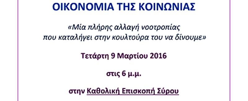 Η Καθολική Επισκοπή Σύρου και το Κίνημα των Φοκολάρι, προσκαλούν στη διάλεξη με θέμα "Οικονομία της Κοινωνίας - Μία πλήρης αλλαγή νοοτροπίας που καταλήγει στην κουλτούρα του να δίνουμε", που θα πραγματοποιηθεί την Τετάρτη 9 Μαρτίου 2016 στις 18:00 το απόγευμα στην Καθολική Επισκοπή Σύρου (Γεωργίου Παπανδρέου 15, Ερμούπολη).
