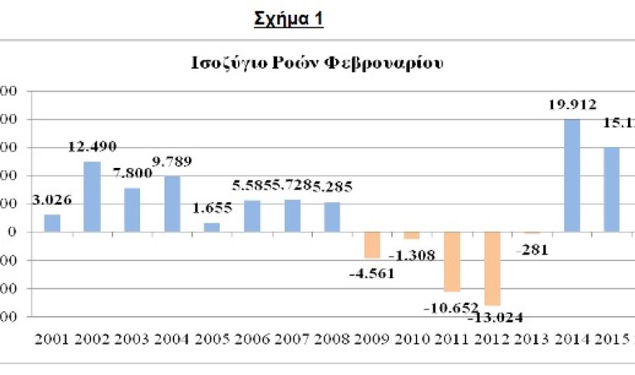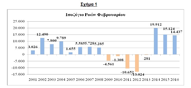 Τα στοιχεία του συστήματος “ΕΡΓΑΝΗ” Φεβρουαρίου 2016 επιβεβαιώνουν τα προηγούμενα. Το ισοζύγιο ροών μισθωτής απασχόλησης Φεβρουαρίου, παρότι θετικό, υστερεί κατά 5.475 θέσεις απασχόλησης συγκριτικά με τον Φεβρουάριο του 2014 (σχήμα 1).