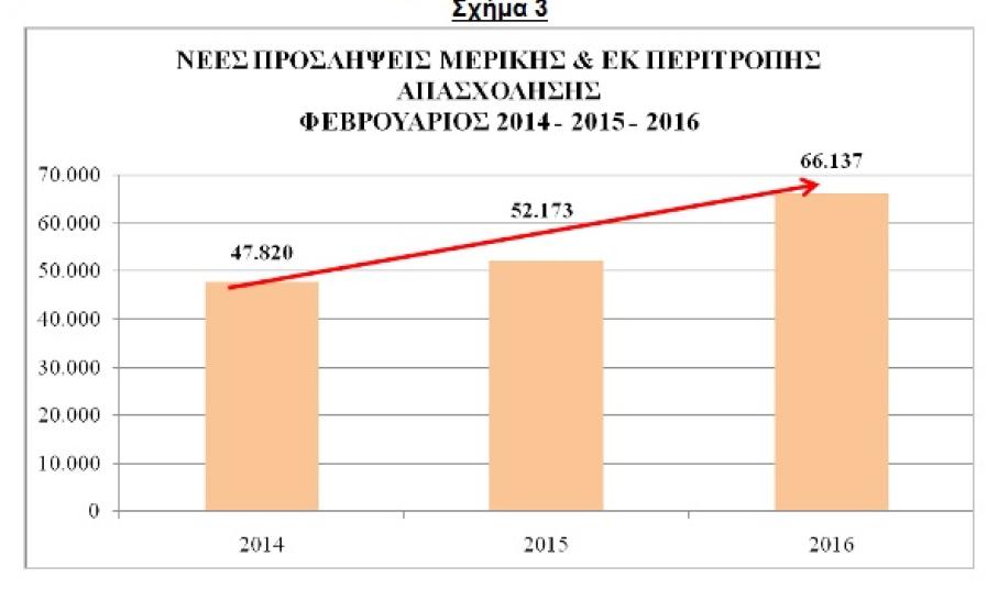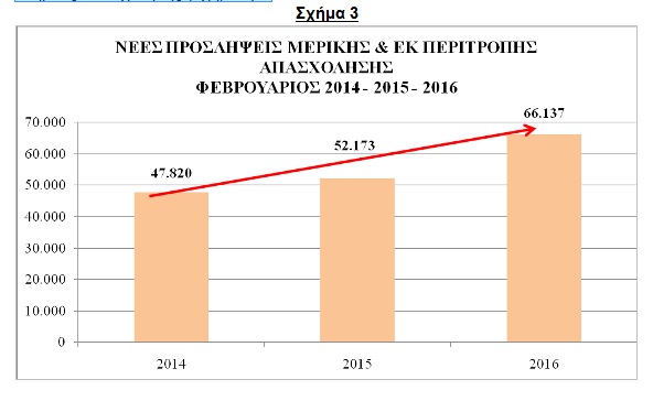 Οι αρνητικές επιδόσεις, όμως, δεν σταματούν εδώ. Η πλήρης απασχόληση συνεχίζει να υποχωρεί υπέρ της μερικής και εκ περιτροπής απασχόλησης. Συγκεκριμένα, οι προσλήψεις μερικής και εκ περιτροπής απασχόλησης από 47.820 το 2014 ανήλθαν σε 66.137 το 2016. Δηλαδή αυξήθηκαν κατά 38%, σε βάρος των νέων προσλήψεων πλήρους απασχόλησης (σχήμα 3)».