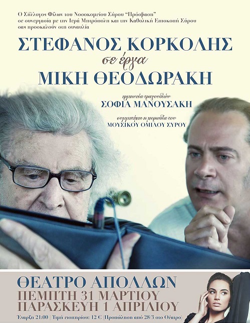 Ο Σύλλογος Φίλων του Νοσοκομείου Σύρου "Πρόσβαση" σε συνεργασία με την Ιερά Μητρόπολη Σύρου και την Καθολική Επισκοπή Σύρου παρουσιάζει τον εξαίρετο Στέφανο Κορκολή σε έργα του σπουδαίου Μίκη Θεοδωράκη.