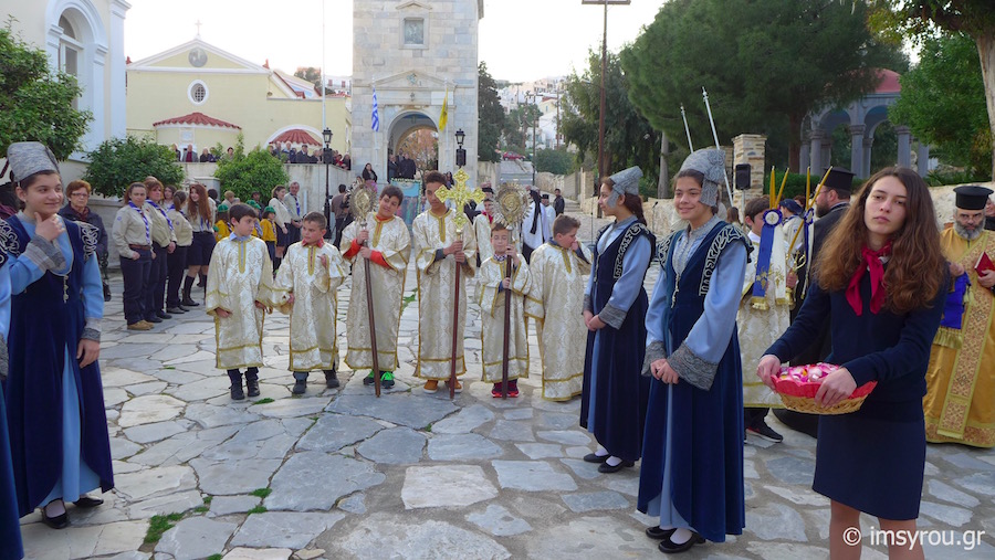 Το ιερό λείψανο τέθηκε προς προσκύνημα στον αύλειο χώρο του Κοιμητηριακού Ιερού Ναού, παρουσία του Δημάρχου Σύρου-Ερμούπολης κ. Γ. Μαραγκού, Αντιδημάρχων και Δημοτικών Συμβούλων, Αξιωματικών και ανδρών του Τάγματος Εθνοφυλακής, οι οποίοι έφεραν την εικόνα, που φυλάσσεται στον Ιερό Ναό Κοιμήσεως της Θεοτόκου Ερμούπολης και του Διοικητού της 6ης Περιφερειακής Διοίκησης του ΛΣ-ΕΛ.ΑΚΤ, κ. Χαράλαμπου Αϊβαλιώτη. Στον Διενοριακό Κατανυκτικό Εσπερινό παρευρέθηκαν επίσης ο Λιμενάρχης Σύρου Ιάκωβος Γκίζης, ο Διοικητής της Ακαδημίας Εμπορικού Ναυτικού Σύρου κ. Ιωάννης Πολέμης ,Νεανίδες του Λυκείου Ελληνίδων, Πρόσκοποι και Οδηγοί καθώς και μαθητές των Κατηχητικών Σχολείων Αγίου Νικολάου και Αγίου Γεωργίου με τους Κατηχητές και τις Κατηχήτριές τους.