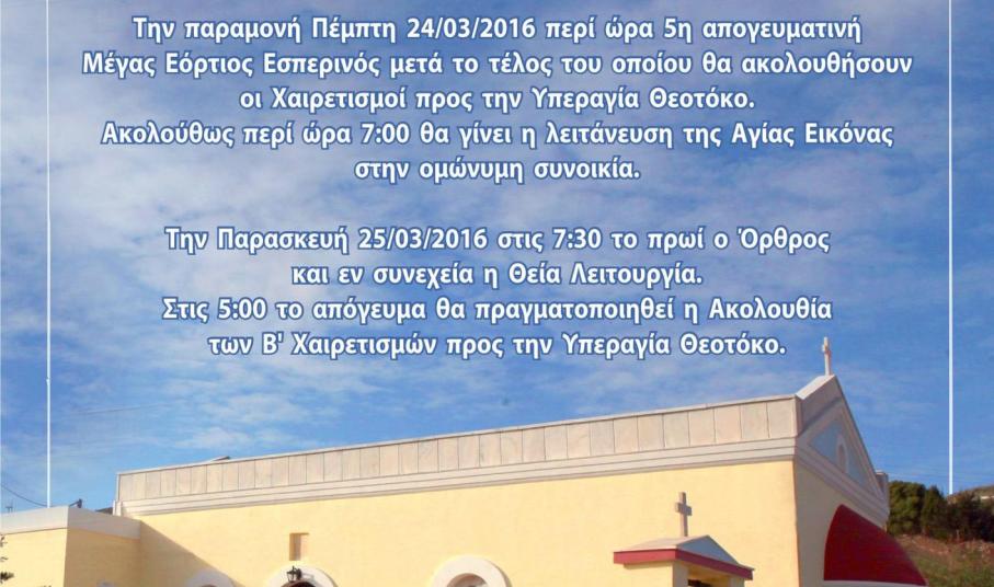 Την παραμονή Πέμπτη 24/3/2016 στις 17:00 θα τελεστεί Μέγας Εόρτιος Εσπερινός μετά το τέλος του οποίου θα ακολουθήσουν οι Χαιρετισμοί προς την Υπεραγία Θεοτόκο. Ακολούθως στις 19:00 θα γίνει η λιτάνευση της Αγίας Εικόνας στην ομώνυμη συνοικία.