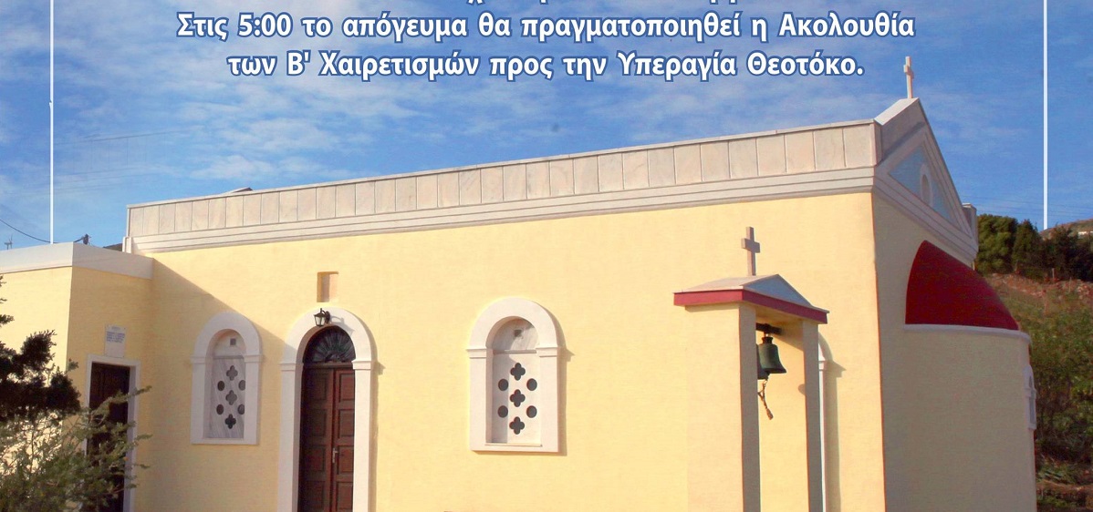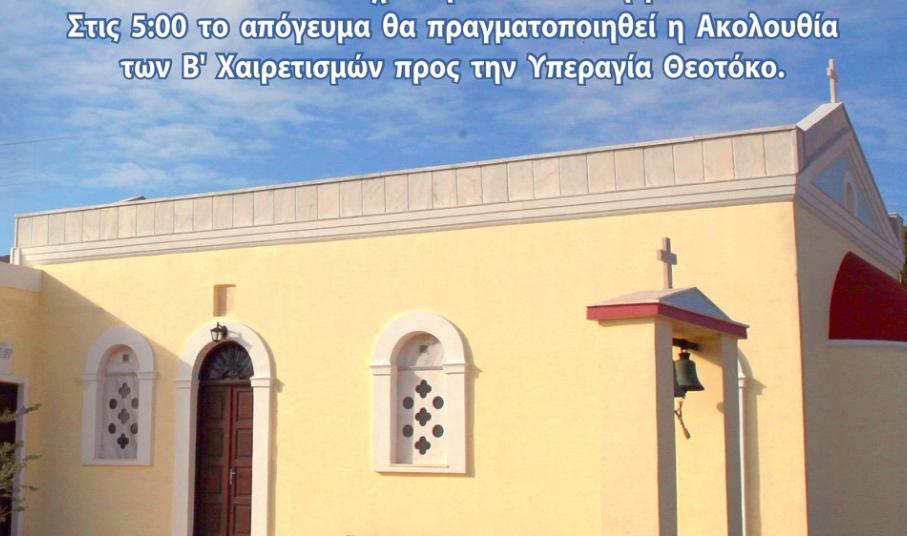 Την Παρασκευή 25/3/2-16 στις 07:30 θα τελεστεί ο Όρθρος και εν συνεχεία η Θεία Λειτουργία. Στις 17:00 θα πραγματοποιηθεί η Ακολουθία των Β’ Χαιρετισμών προς την Υπεραγία Θεοτόκο.
