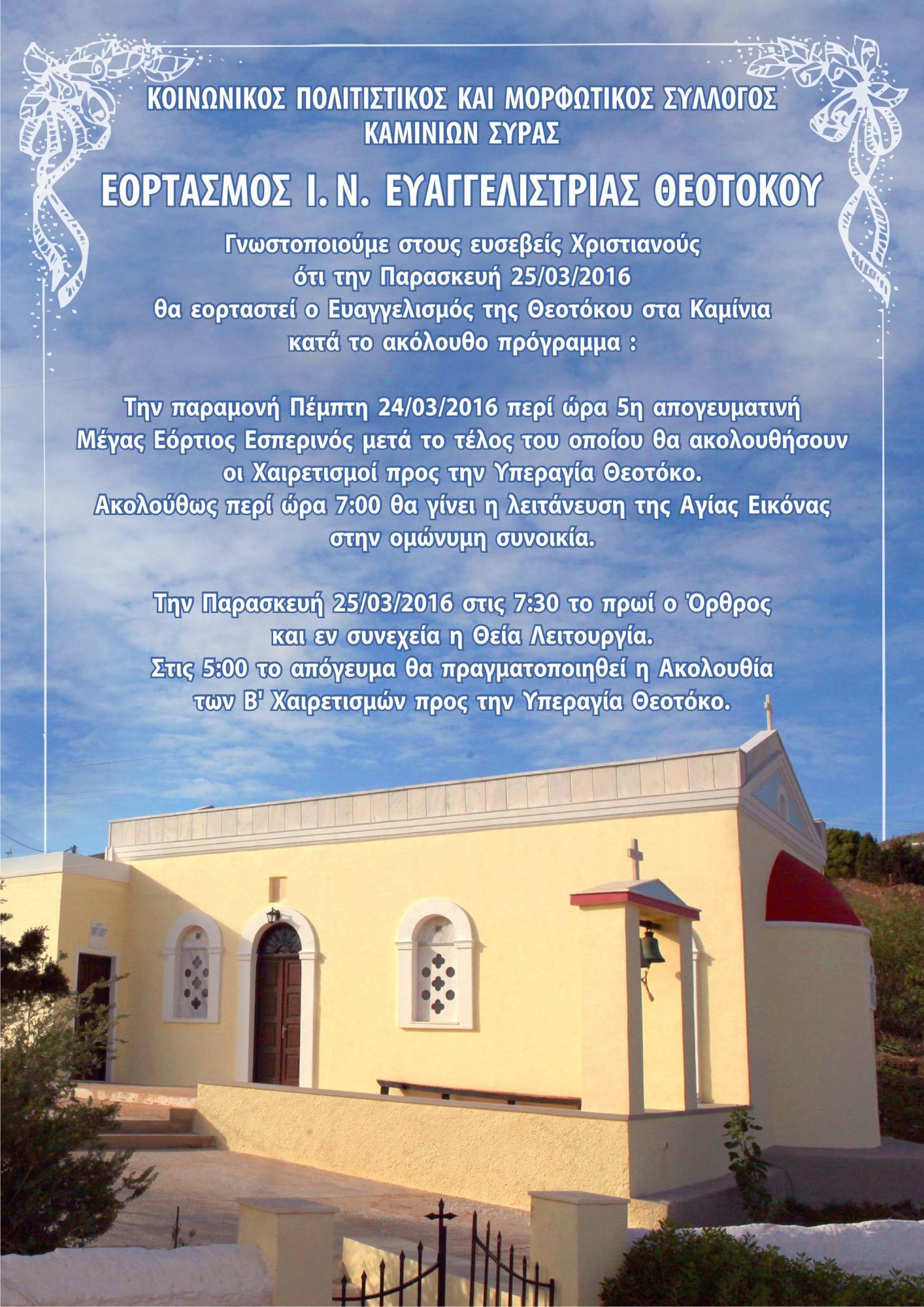 Ο Κοινωνικός Πολιτιστικός και Μορφωτικός Σύλλογος Καμινίων Σύρου ενημερώνει τους ευσεβείς Χριστιανούς ότι την Παρασκευή 25 Μαρτίου 2016 θα εορτασθεί ο Ευαγγελισμός της Θεοτόκου στα Καμίνια κατά το ακόλουθο πρόγραμμα: