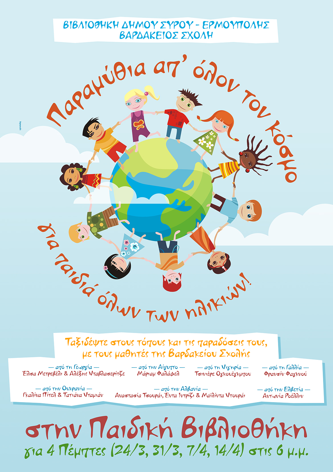 Ένα μοναδικό ταξίδι ψυχαγωγίας και περιπέτειας διοργανώνεται στην παιδική βιβλιοθήκη του Δήμου Σύρου – Ερμούπολης με τους μαθητές της Βαρδακείου Σχολής να προσκαλούν τα παιδιά και τους γονείς να ταξιδέψουν σε όλο τον κόσμο μέσα από παραμύθια άλλων χωρών.