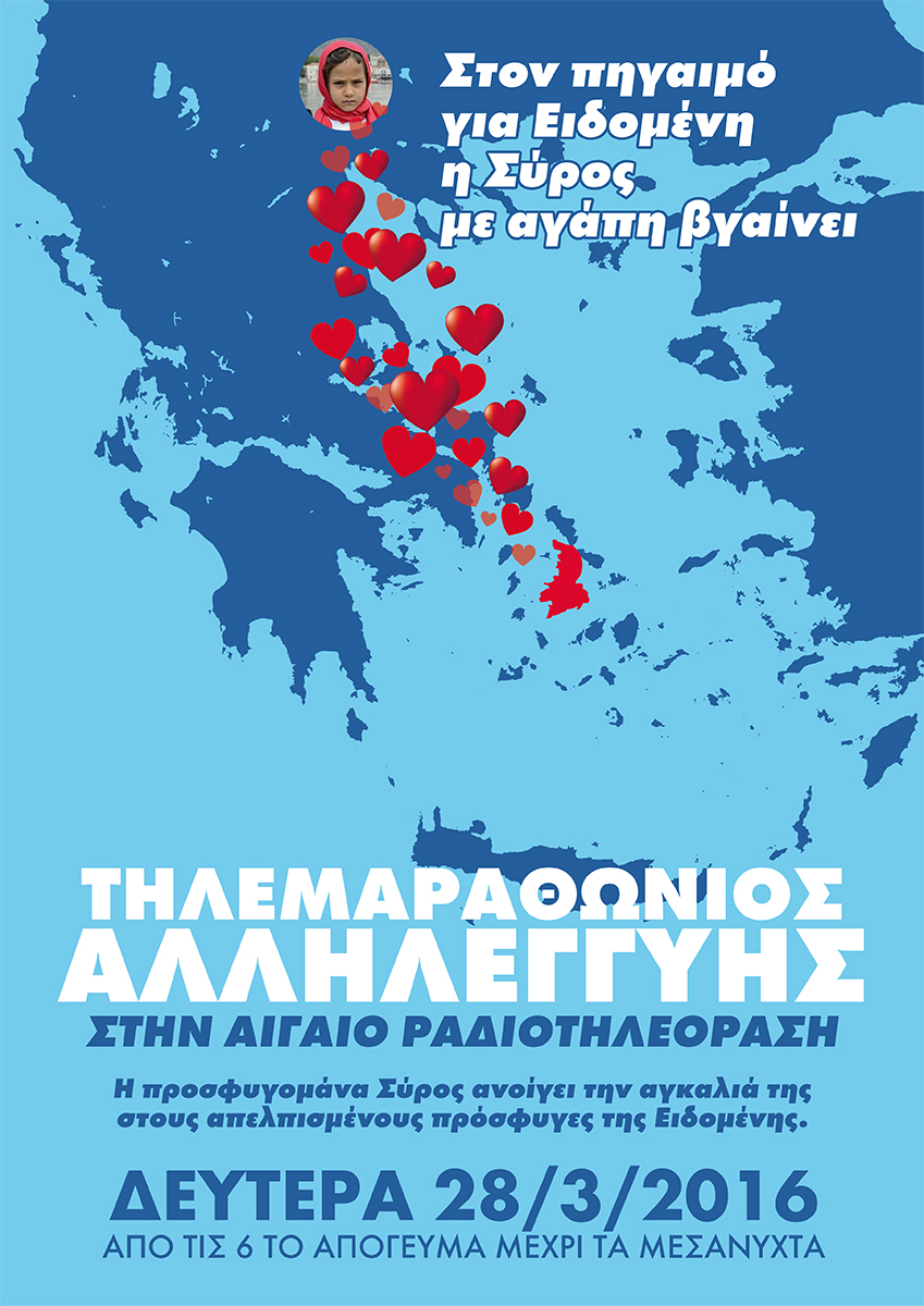 Η ΑΙΓΑΙΟ ΡΑΔΙΟΤΗΛΕΟΡΑΣΗ και οι ΠΟΛΙΤΙΣΤΙΚΟΙ ΣΥΛΛΟΓΟΙ ΑΝΩ ΣΥΡΟΥ –ΓΑΛΗΣΣΑ- ΜΙΚΡΑΣΙΑΤΩΝ- ΠΕΛΟΠΟΝΝΗΣΙΩΝ-ΠΟΝΤΙΩΝ ΚΑΙ ΒΟΡΕΙΟΕΛΛΑΔΙΤΩΝ -ΠΟΣΕΙΔΩΝΙΑΣ ‘’Ο ΠΟΣΕΙΔΩΝ’’ και ΤΟ ΣΩΜΑ ΕΛΛΗΝΩΝ ΠΡΟΣΚΟΠΩΝ ΣΥΡΟΥ υπό την αιγίδα και την υποστήριξη του ΔΗΜΟΥ ΣΥΡΟΥ-ΕΡΜΟΥΠΟΛΗΣ διοργανώνουν ΡΑΔΙΟΤΗΛΕΜΑΡΑΘΩΝΙΟ ΑΛΛΗΛΕΓΓΥΗΣ ΓΙΑ ΤΟΥΣ ΠΡΟΣΦΥΓΕΣ ΤΗΣ ΕΙΔΟΜΕΝΗΣ.