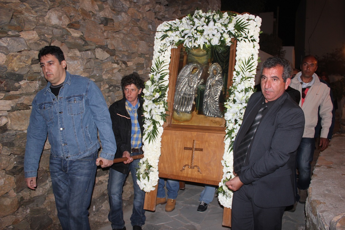 Στο πλαίσιο του εορτασμού, τελέστηκε Μέγας Εόρτιος Εσπερινός, μετά το τέλος του οποίου ακολούθησαν οι Χαιρετισμοί προς την Υπεραγία Θεοτόκο. Στη συνέχεια, πραγματοποιήθηκε λιτανευτική πομπή της Αγίας Εικόνος στην περιοχή των Καμινίων, η οποία φρεσκαρίστηκε, ανανεώθηκε και έλαμψε χάρη στο ζήλο, την προσπάθεια και την προσωπική εργασία μελών του Κοινωνικού Πολιτιστικού και Μορφωτικού Συλλόγου Καμινίων Σύρου. Στον Εσπερινό συνλειτούργησαν οι ιερείς ο π. Δωρόθεος Γάγγος και ο π. Κωνσταντίνος Κοντός.