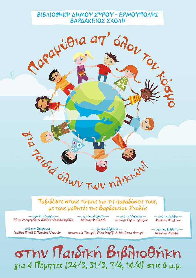 Με αφορμή τον εορτασμό της Παγκόσμιας Ημέρας Παιδικού Βιβλίου (2 Απριλίου), η Δημοτική Βιβλιοθήκη του Δήμου Σύρου – Ερμούπολης, σε συνεργασία με τη Βαρδάκειο Σχολή, έχει ξεκινήσει ένα ταξίδι με παραμυθο -ιστορίες απ' όλον τον κόσμο, που θα διαρκέσει τέσσερις (4) εβδομάδες (24/3, 31/3, 7/4, 14/4).