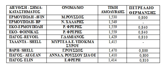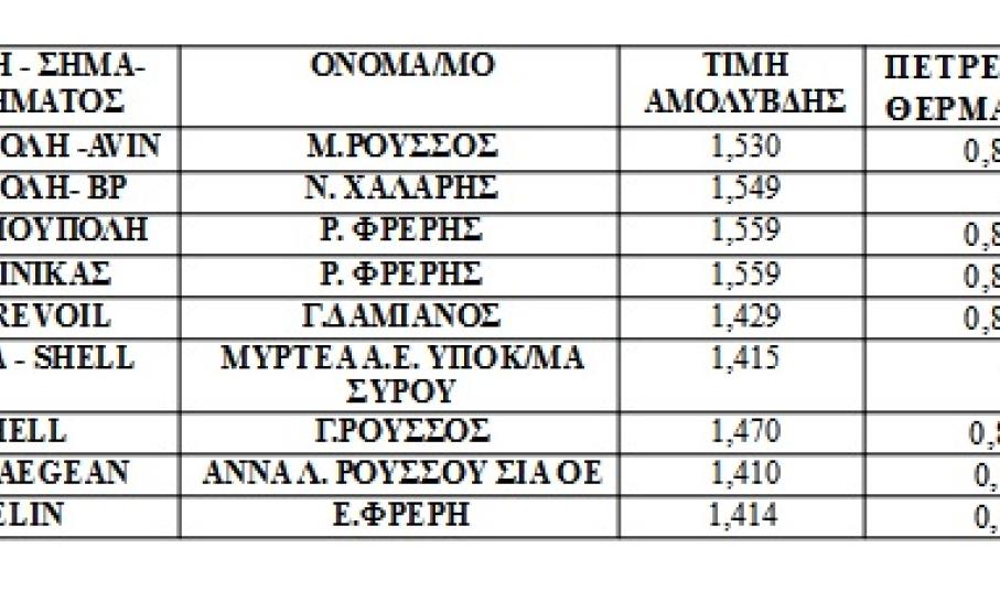 Το Τμήμα Εμπορίου της Διεύθυνσης Ανάπτυξης Κυκλάδων δημοσιεύει τις σημερινές τιμές πώλησης της αμόλυβδης βενζίνης που διατίθεται από τα πρατήρια υγρών καυσίμων της Σύρου.
