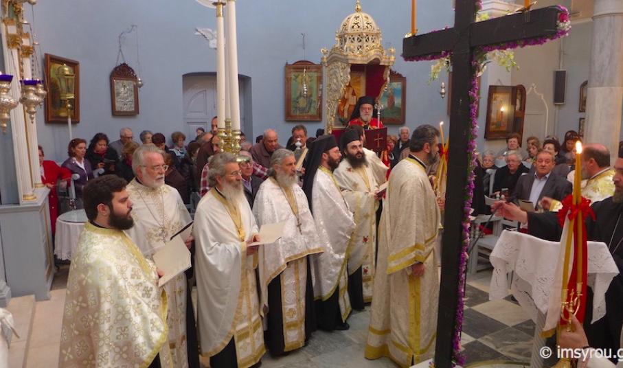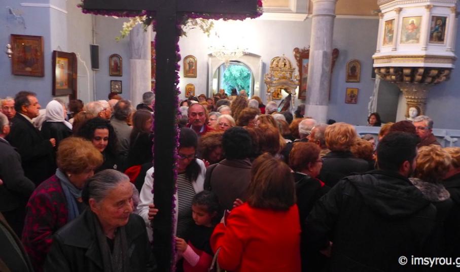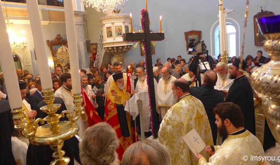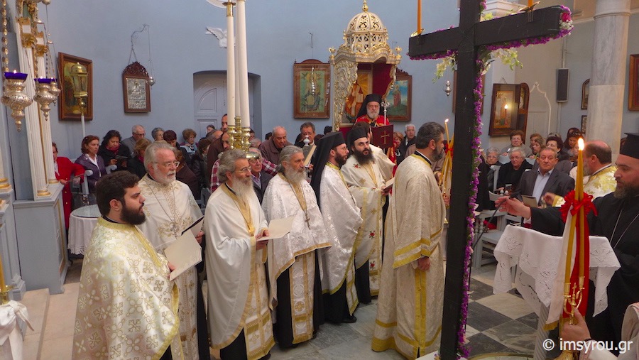 Της Διενοριακής Συνάξεως της Ακολουθίας των Χαιρετισμών προς τον Τίμιο Σταυρό προεξήρχε χθες το απόγευμα στον Ιερό Ναό της Αγίας Παρασκευής ο Σεβασμιώτατος Μητροπολίτης Σύρου κ. Δωρόθεος Β’, με τη συμμετοχή όλων των Εφημερίων του νησιού, οι οποίοι ανέγνωσαν κατά σειράν και τα πρεσβεία τους Οίκους των Χαιρετιμούς.