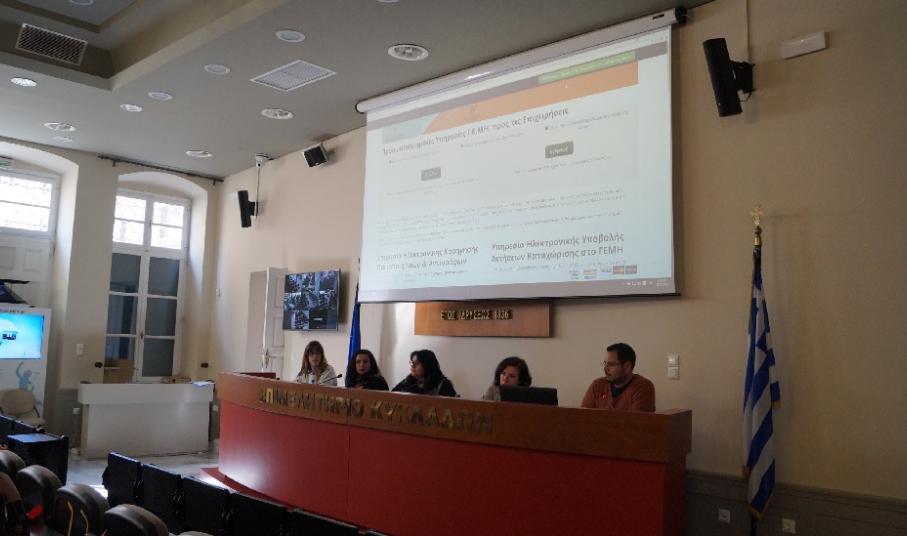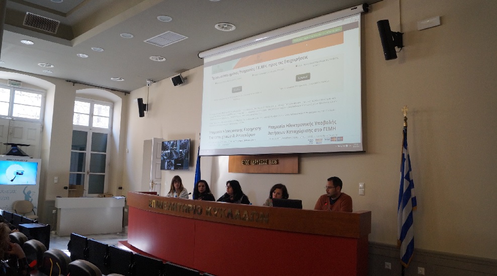 Η προσέλευση ήταν ικανοποιητική και η συνάντηση διήρκησε περίπου 2 ώρες, ξεκινώντας από παρουσίαση του portal του Επιμελητηρίου Κυκλάδων www.e-kyklades.gr και συγκεκριμένα της ενότητας που αφορά στην πληροφόρηση μελών. Στη συνέχεια, έγινε πλοήγηση στη διαδικτυακή πύλη του Γ.Ε.ΜΗ. www.businessportal.gr όπου μέσα σε πραγματικό περιβάλλον επιχείρησης αναλύθηκαν θέματα που αντιμετωπίζουν οι χρήστες της ιστοσελίδας. Ακολούθησε πλήρης ανάλυση των δυνατοτήτων και υπηρεσιών του Μητρώου Επιχειρήσεων (Business Registry) και της Επιχειρηματικής Πύλης (Business Portal), καθώς και σύντομη αναφορά στην Υπηρεσία-Μίας-Στάσης.