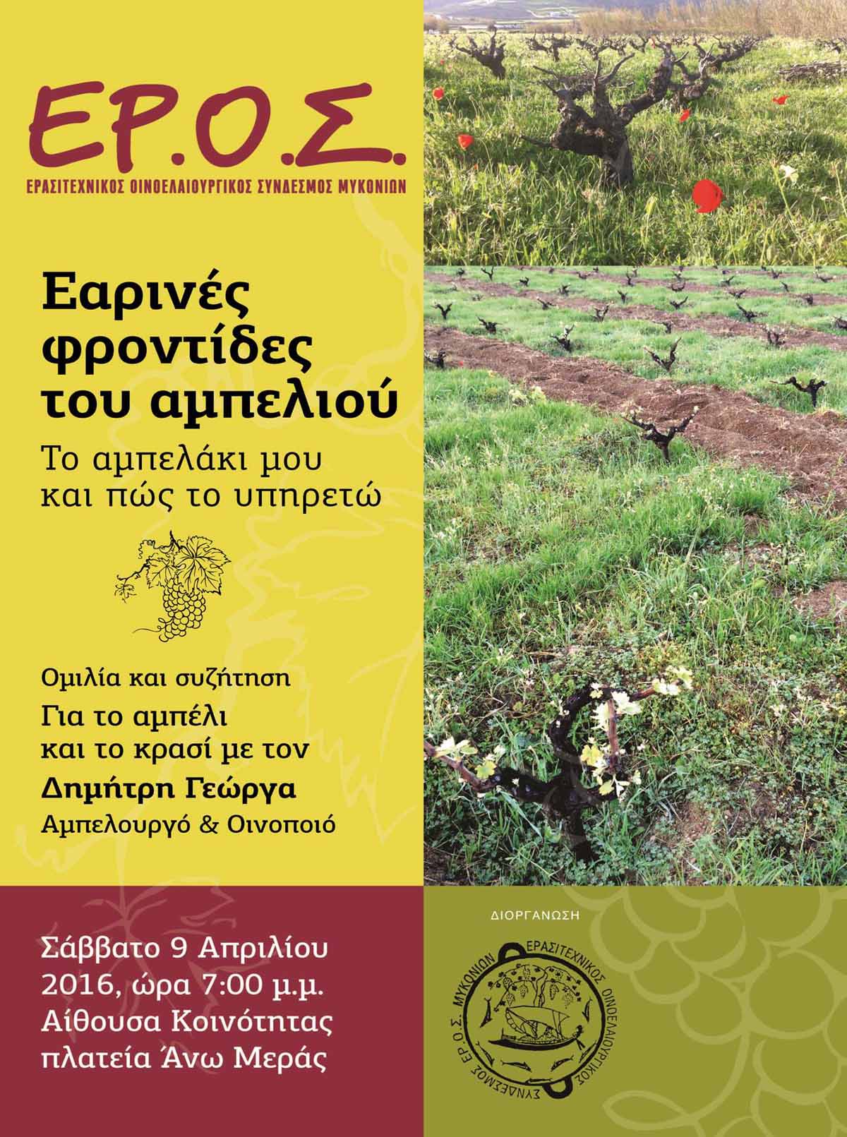 Ο παλιός γνώριμος του Ερασιτεχνικού Οινοελαιουργικού Συλλόγου Μυκονίων, Δημήτρης Γεωργάς επισκέπτεται για τρίτη φορά το νησί της Μυκόνου, προκειμένου να μοιραστεί τις γνώσεις και την εμπειρία του με τα μέλη του Συλλόγου. Ο γνωστός αμπελουργός και οινοποιός με την αμεσότητα, τη σαφήνεια και την ευαισθησία που τον διακρίνει, θα πραγματοποιήσει επισκέψεις σε αμπέλια μελών του Συλλόγου, ώστε να γίνουν οι απαραίτητες παρατηρήσεις και ανταλλαγή απόψεων. Επιπλέον, πέραν της εισήγησης, η διάθεση περισσότερου χρόνου για συζήτηση που αφορά στις απαραίτητες φροντίδες του αμπελιού, θα λύσει απορίες γενικές και ειδικές που αφορούν τις έγνοιες των ερασιτεχνών αμπελουργών του νησιού για την παραγωγή κρασιού, που αντανακλά καλύτερα την ιδιαιτερότητα του τόπου και του κόπου όλων μας.