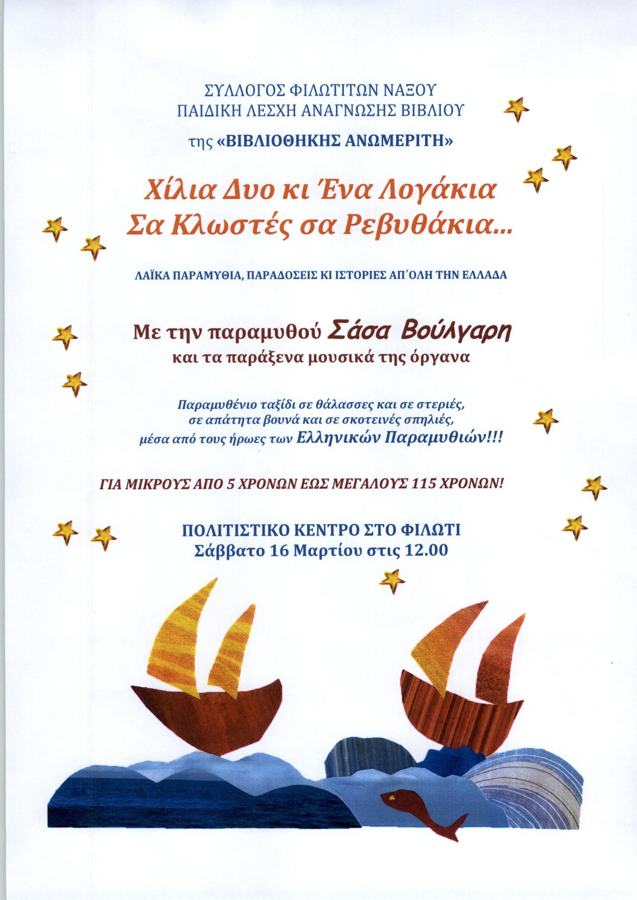 «Χίλια Δυο κι Ένα Λογάκια, Σαν Κλωστές σα Ρεβυθάκια» είναι ο τίτλος της εκδήλωσης αφήγησης παραμυθιών που διοργανώνει η παιδική λέσχη ανάγνωσης βιβλίου της «Βιβλιοθήκης Ανωμερίτη» του Συλλόγου Φιλωτιτών Νάξου.