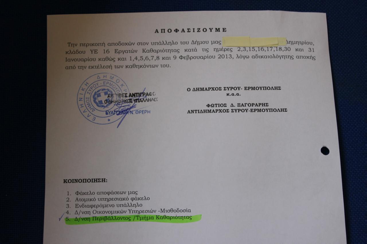 Σε περικοπή αποδοχών έχει προχωρήσει η δημοτική αρχή του δήμου Σύρου – Ερμούπολης, με αντίστοιχη απόφασή της, αναφορικά με τα περιστατικά αδικαιολόγητης αποχής υπαλλήλων από τα καθήκοντά τους στις υπηρεσίες Καθαριότητας.