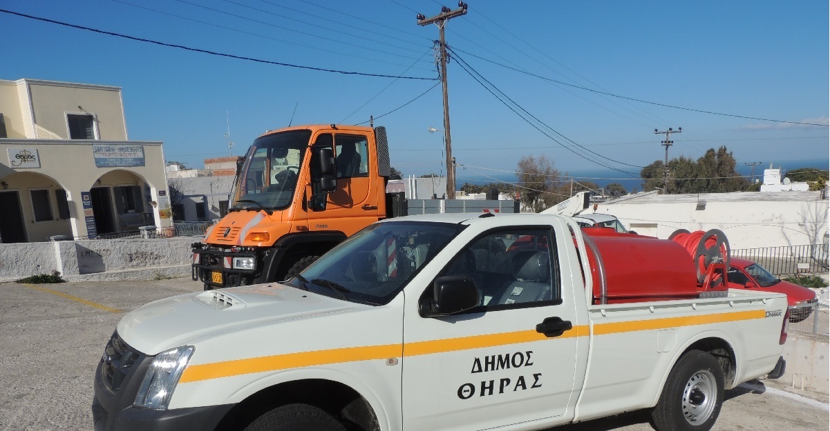 Συγκεκριμένα, στο πλαίσιο Πολιτικής Προστασίας του δήμου Θήρας και του Προγράμματος Δημοσίων Επενδύσεων 2012, η δημοτική αρχή εξασφαλίζοντας το ποσό των 28.290 ευρώ, προέβη στην αγορά ενός πυροσβεστικού οχήματος με σκοπό να αντιμετωπίζει τον ενδεχόμενο κίνδυνο από πιθανή πρόκληση πυρκαγιάς.