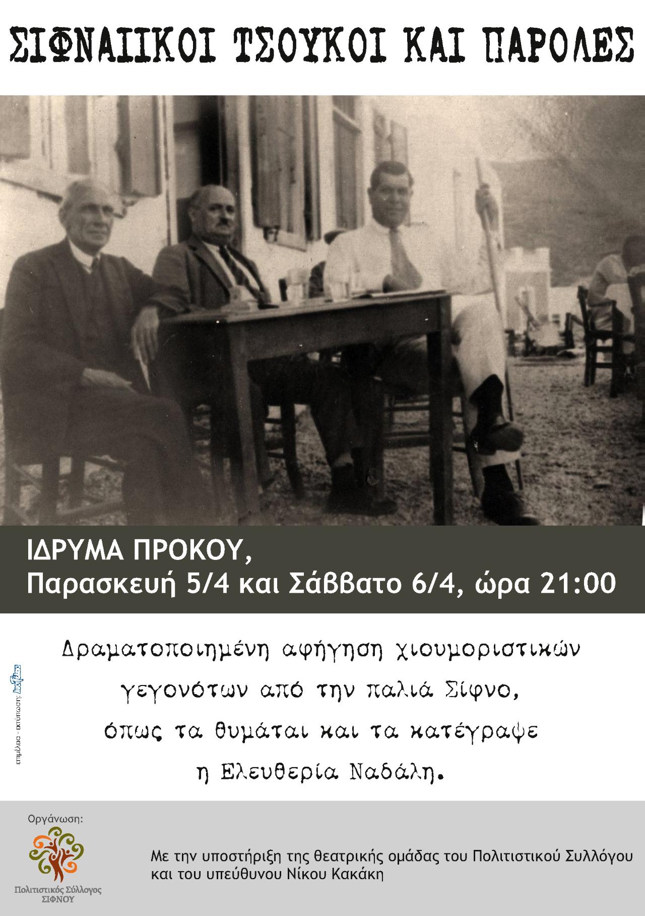 Τέτοιες ιστορίες, θα ακουστούν σήμερα και αύριο στη Σίφνο. Σιφναίικοι «τσούκες και παρόλες», μια δραματοποιημένη αφήγηση χιουμοριστικών γεγονότων από την παλιά Σίφνο, όπως τα θυμάται και τα κατέγραψε η Ελευθερία Ναδάλη, θα έχουν την ευκαιρία να «γευτούν» κάτοικοι και επισκέπτες, στις 9 το βράδυ στο Ίδρυμα Πρόκου. Την εκδήλωση διοργανώνει ο Πολιτιστικός Σύλλογος Σίφνου, με την υποστήριξη της θεατρικής του ομάδας και του υπευθύνου της Νίκου Κακάκη.