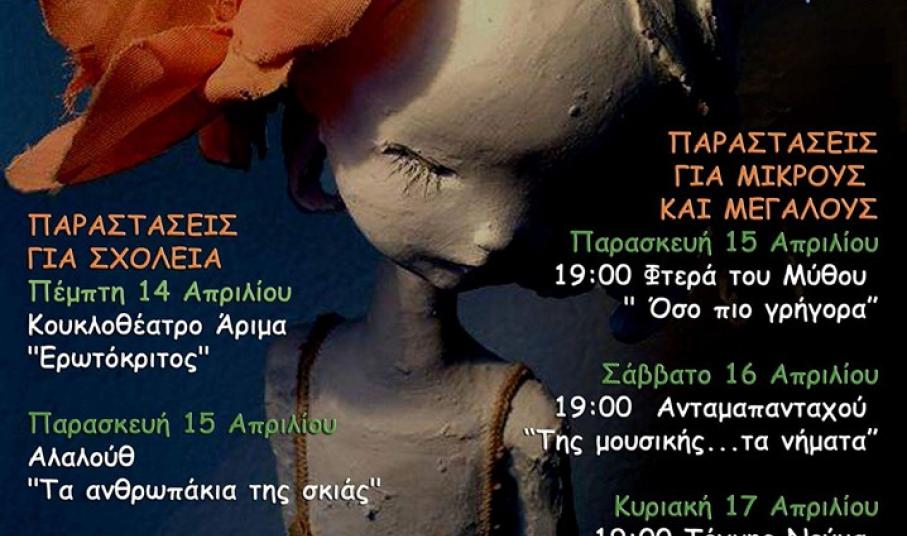 Επιπλέον, μικροί και μεγάλοι θα έχουν την ευκαιρία να παρακολουθήσουν τρεις παραστάσεις. Την Παρασκευή 15 Απριλίου στις 19:00 το θέατρο κούκλας «Φτερά του Μύθου» έρχεται με την παράσταση «Όσο πιο γρήγορα», που βασίζεται στην κινηματογραφική ταινία «Τα παιδιά του Παραδείσου» του Ματζίντ Ματζιντί. Μια τρυφερή και ευαίσθητη ιστορία με πρωταγωνιστές δύο παιδιά που κατορθώνουν μέσα από την συνεργασία και την αγάπη τους να κερδίσουν με αξιοπρέπεια τον αγώνα της ζωής τους.