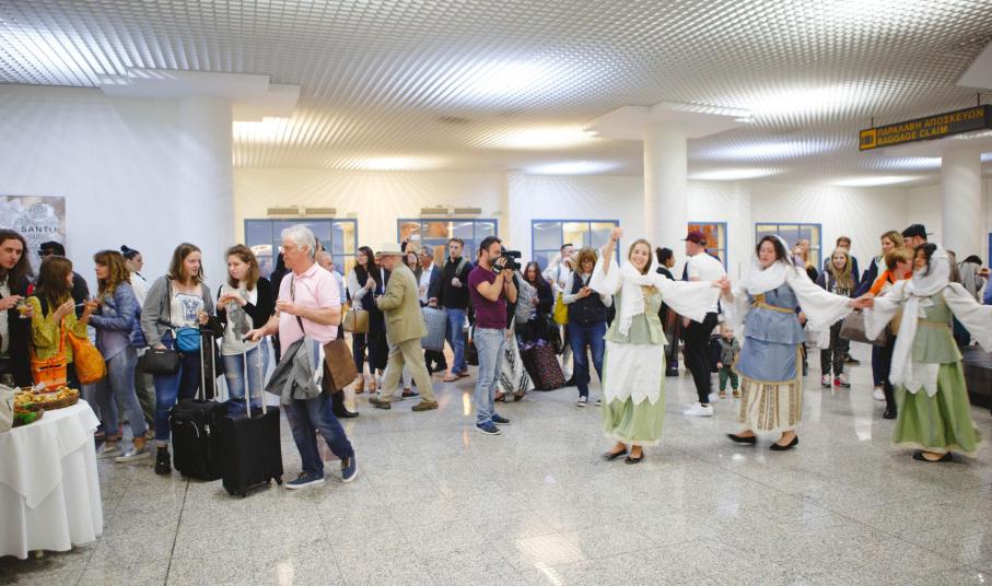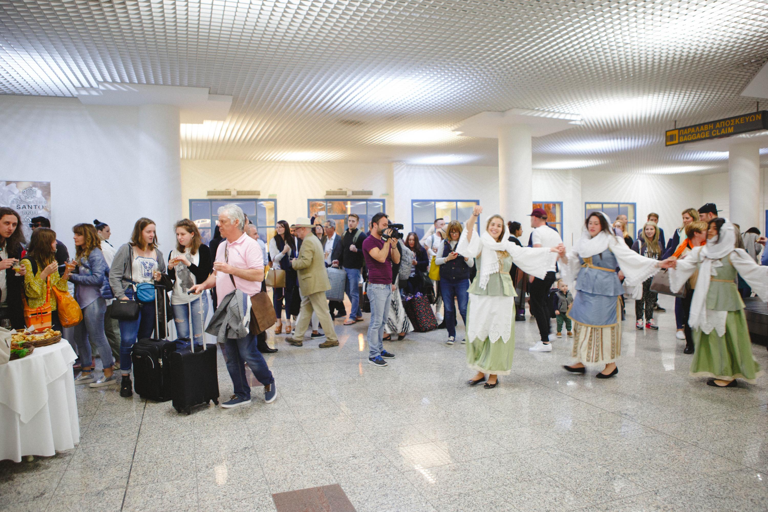 Οι επιβάτες της πτήσης περιμένοντας τις αποσκευές τους είχαν την ευκαιρία να δοκιμάσουν τοπικά παραδοσιακά εδέσματα και σαντορινιό κρασί , να ακούσουν και να χορέψουν με την παραδοσιακή μουσική των κκ. Κυριάκου Πρέκα (λαούτο) και Νίκου Μπάικα (βιολί) και του χορευτικού τους συγκροτήματος.