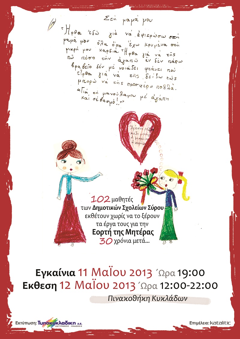 Τί μπορεί να κρύβει ένα παλαιό έπιπλο για μία Μάνα, πόσα συναισθήματα μπορεί να χωρέσει μία παιδική ζωγραφιά για τη γιορτή της Μητέρας αλλά και πώς αποτύπωναν την αγάπη τους οι μαθητές της Στ΄ Δημοτικού πριν από τριάντα χρόνια, είναι ερωτήματα που θα απαντηθούν μέσα από μία ξεχωριστή έκθεση αυτό το Σαββατοκύριακο στην Πινακοθήκη Κυκλάδων.