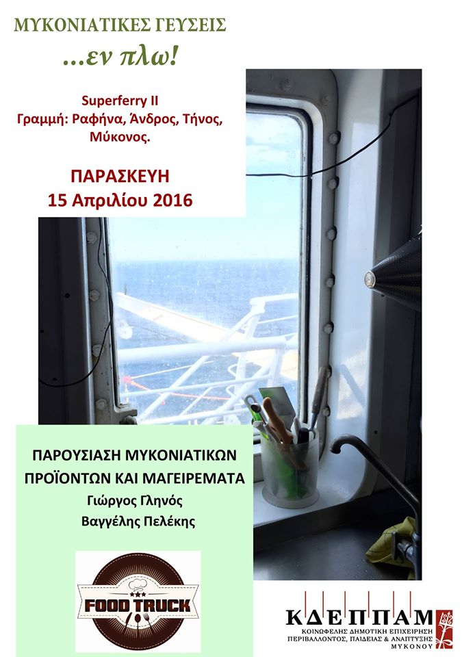 Ο Γιώργος Γληνός της γνωστής καντίνας Food Truck και ο Βαγγέλης Πελέκης θα μαγειρέψουν για το κοινό του Superferry II, σήμερα 15 Απριλίου 2016, στο πλαίσιο των εκδηλώσεων «Μυκονιάτικες γεύσεις εν πλω...» που οργανώνονται από το Δήμο Μυκόνου και την Κοινωφελή Δημοτική Επιχείρηση Περιβάλλοντος Παιδείας και Ανάπτυξης Μυκόνου.