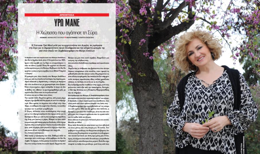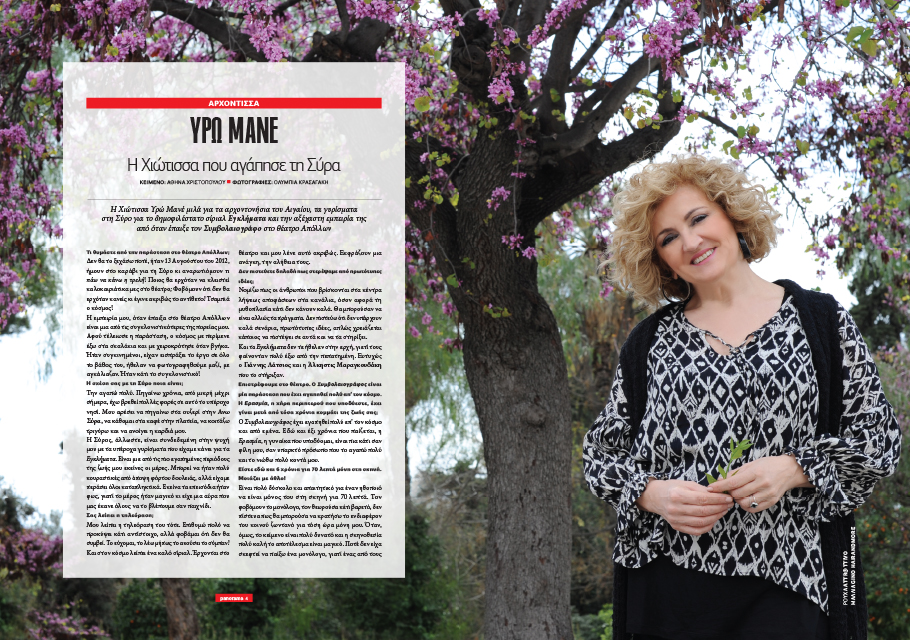 Οι αναγνώστες έχουν επίσης την ευκαιρία να διαβάσουν μία απολαυστική συνέντευξη της Χιώτισσας Υρώς Μανέ, η οποία μιλά για τα αρχοντονήσια του Αιγαίου, τα γυρίσματα στη Σύρο για το δημοφιλέστατο σήριαλ «Εγκλήματα» και την αξέχαστη εμπειρία της από όταν έπαιξε τον «Συμβολαιογράφο» στο θέατρο Απόλλων.