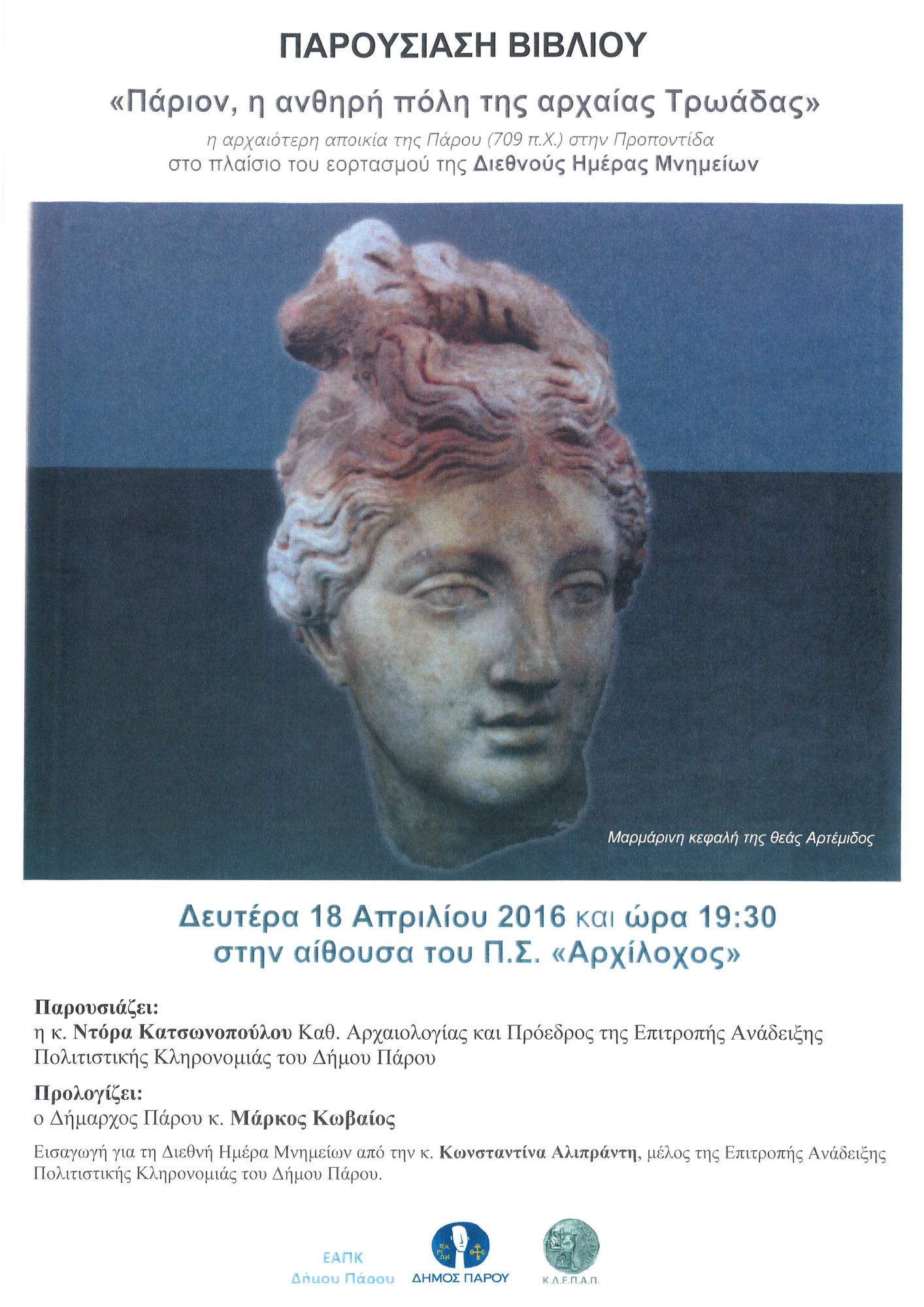 Η Επιτροπή Ανάδειξης Πολιτιστικής Κληρονομιάς του Δήμου Πάρου και η Κ.Δ.Ε.Π.Α.Π. στο πλαίσιο του εορτασμού της Διεθνούς Ημέρας Μνημείων σας προσκαλούν στην παρουσίαση του βιβλίου «Πάριον, η ανθηρή πόλη της αρχαίας Τρωάδας», η αρχαιότερη αποικία της Πάρου (709 π.Χ.) στην Προποντίδα τη Δευτέρα 18 Απριλίου 2016 και ώρα 19:30 στην αίθουσα του Π.Σ. «Αρχίλοχος» - Παροικία.