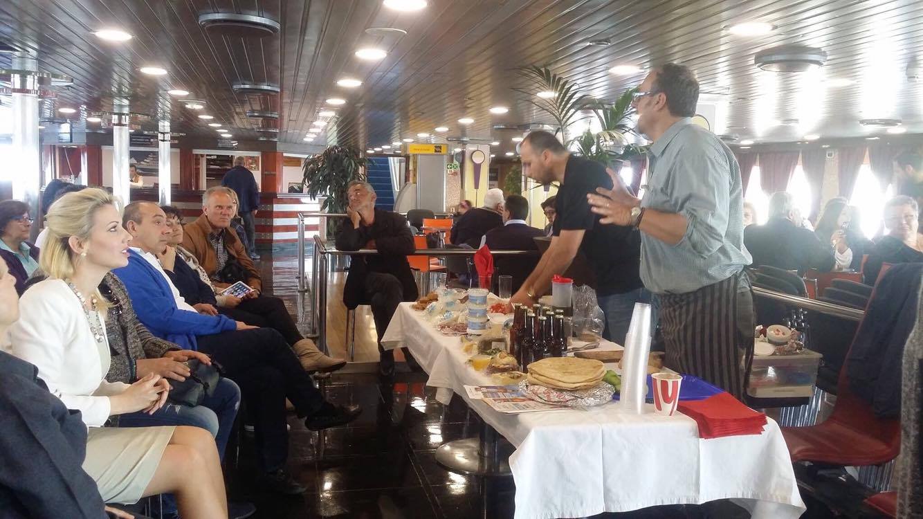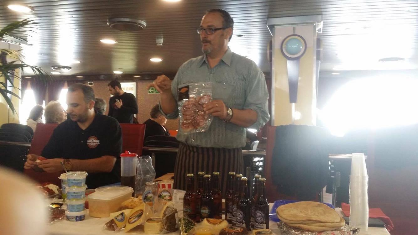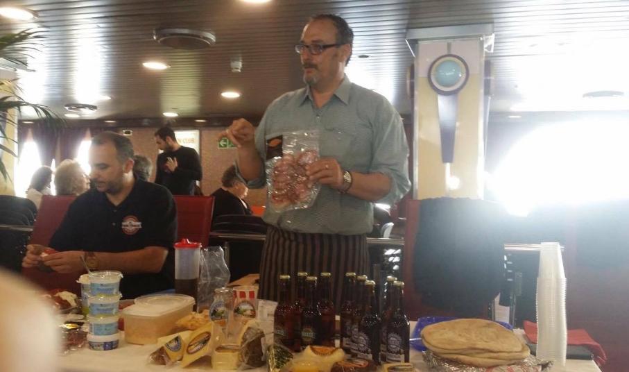 Η λούζα, το λουκάνικο, το ξινότυρο, το γιαούρτι, η τυροβολιά, η κοπανιστή, καθώς και προϊόντα ζύμης νοστίμισαν την περασμένη Παρασκευή το δρομολόγιο του Superferry II, όπου ο ιδιοκτήτης της πρώτης περιφερόμενης καντίνας στην Ελλάδα «Food Τruck» Γιώργος Γλυνός και ο συγγραφέας της «Κουζίνας του Balthazar» Βαγγέλης Πελέκης ένωσαν τις μαγειρικές δυνάμεις τους, χαρίζοντας στο επιβατικό κοινό συγκινήσεις made in Mykonos.