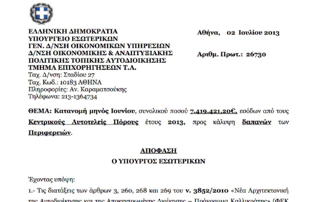 Αξίζει να αναφερθεί ότι, “τα χρήματα αυτά προέρχονται από το λογαριασμό του υπουργείου Εσωτερικών που τηρείται στο Ταμείο Παρακαταθηκών και Δανείων με τον τίτλο “Κεντρικοί Αυτοτελείς Πόροι των Περιφερειών”.