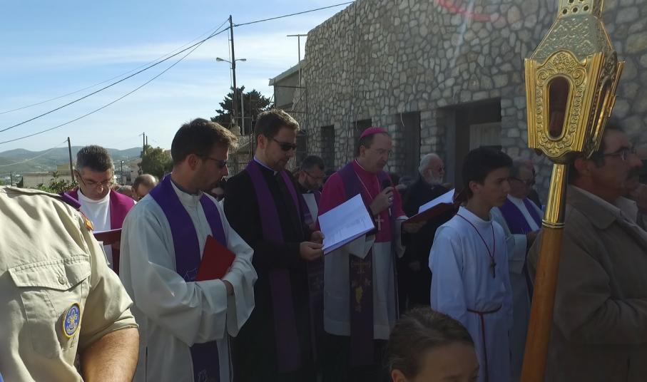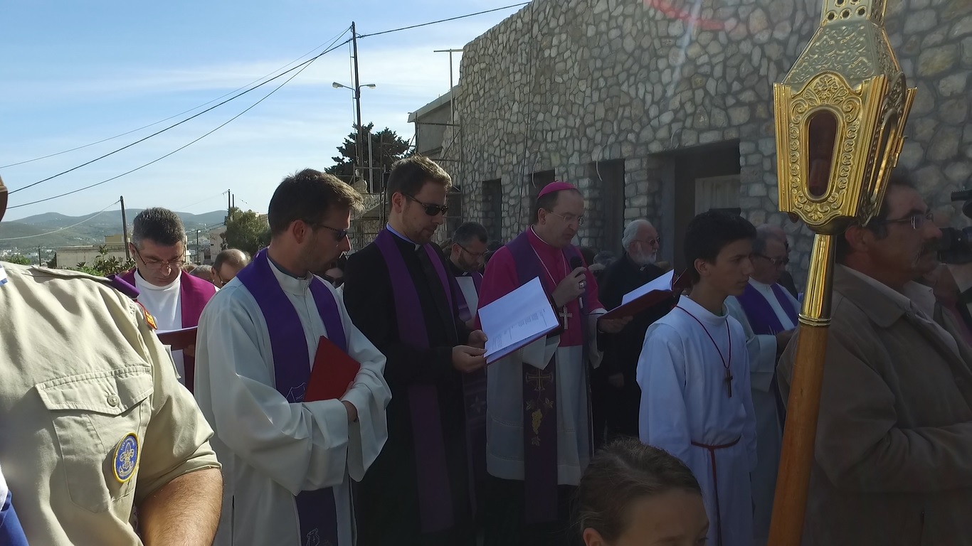 Στην αρχή ο συναθροισμένος λαός έψαλλε το Άσμα «Προβάλλει, ως λάβαρον, λαμπρός, -μυστήριον θείον- ο Σταυρός……», για να δημιουργηθεί πνεύμα σιωπής και προσευχής, ενώ στη συνέχεια, ο Καθολικός Επίσκοπος Σύρου απηύθυνε δέηση στο Θεό.